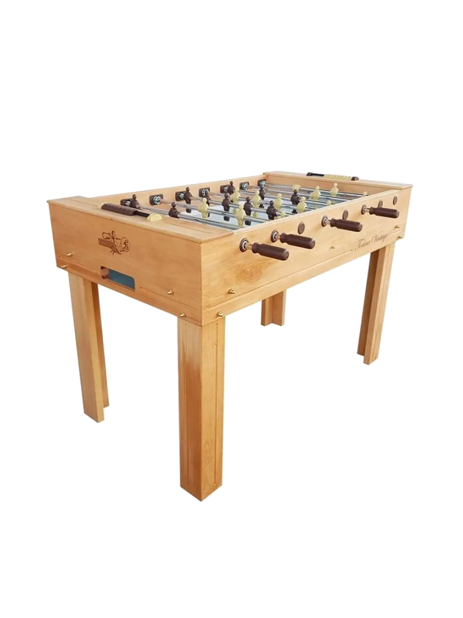 Indoor-Kickertisch für alle, die beim Stil keine Kompromisse eingehen. Komplett handgefertigt aus Buche, mit glänzend lackierter Außenseite und Naturholz zur Dämpfung des Ballaufpralls im Inneren. Dank der sorgfältigen Liebe zum Detail werden Sie erstaunt sein, wie Eleganz und Spielkomfort miteinander harmonieren: Stangen mit 18 mm Durchmesser, genau wie bei Profis.